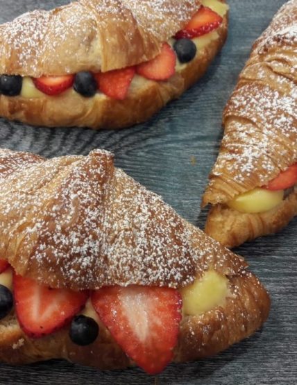 Versier je ochtend of verwen een geliefde met deze zachte, luchtige croissant gevuld met romige banketbakkersroom en zoet rood fruit. Afgewerkt met poedersuiker of een vleugje chocolade.